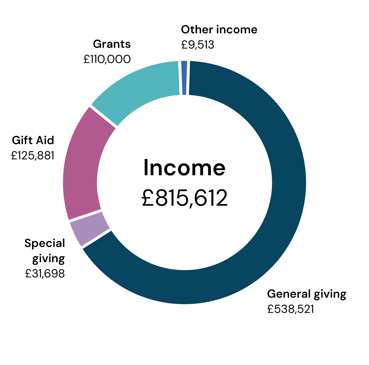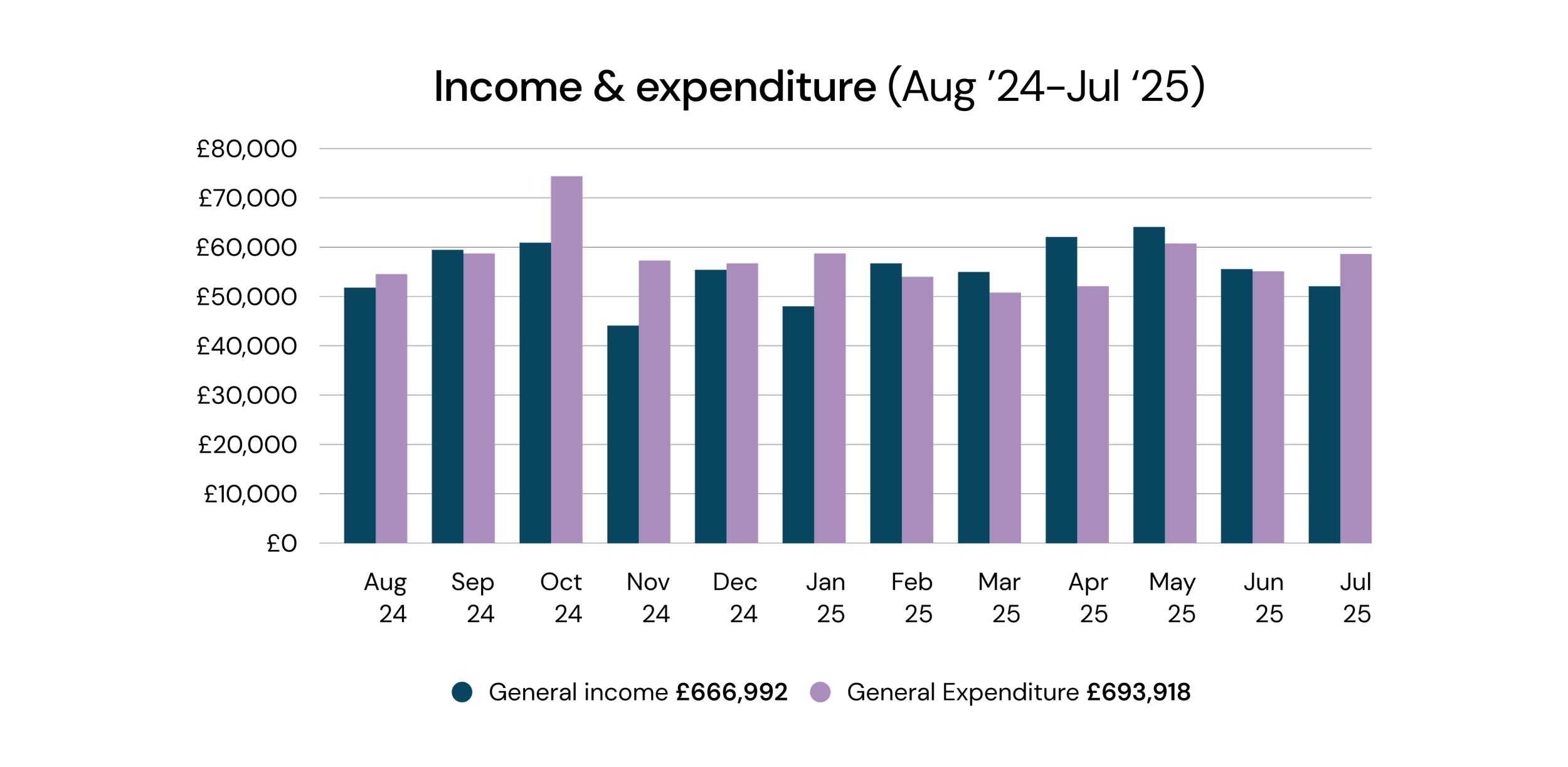 Income: A total of £666,992 came into the general fund this year. Notable spikes in September, October, April, and May were the result of large one-off donations and catch-up Gift Aid claims. Excluding these anomalies, giving showed a slight upward trend across the year.