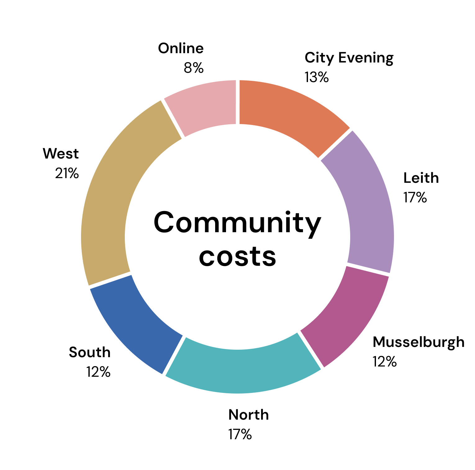 Costs directly attributable to a Community include venue rental and Pastor’s salary. Shared costs include other salaries, many ministry costs, and general overheads. It is not practical to allocate shared costs precisely but for illustrative purposes, various approximations have been made: some being shared equally, others apportioned based on Community size, whilst others take account of further differences between Communities.