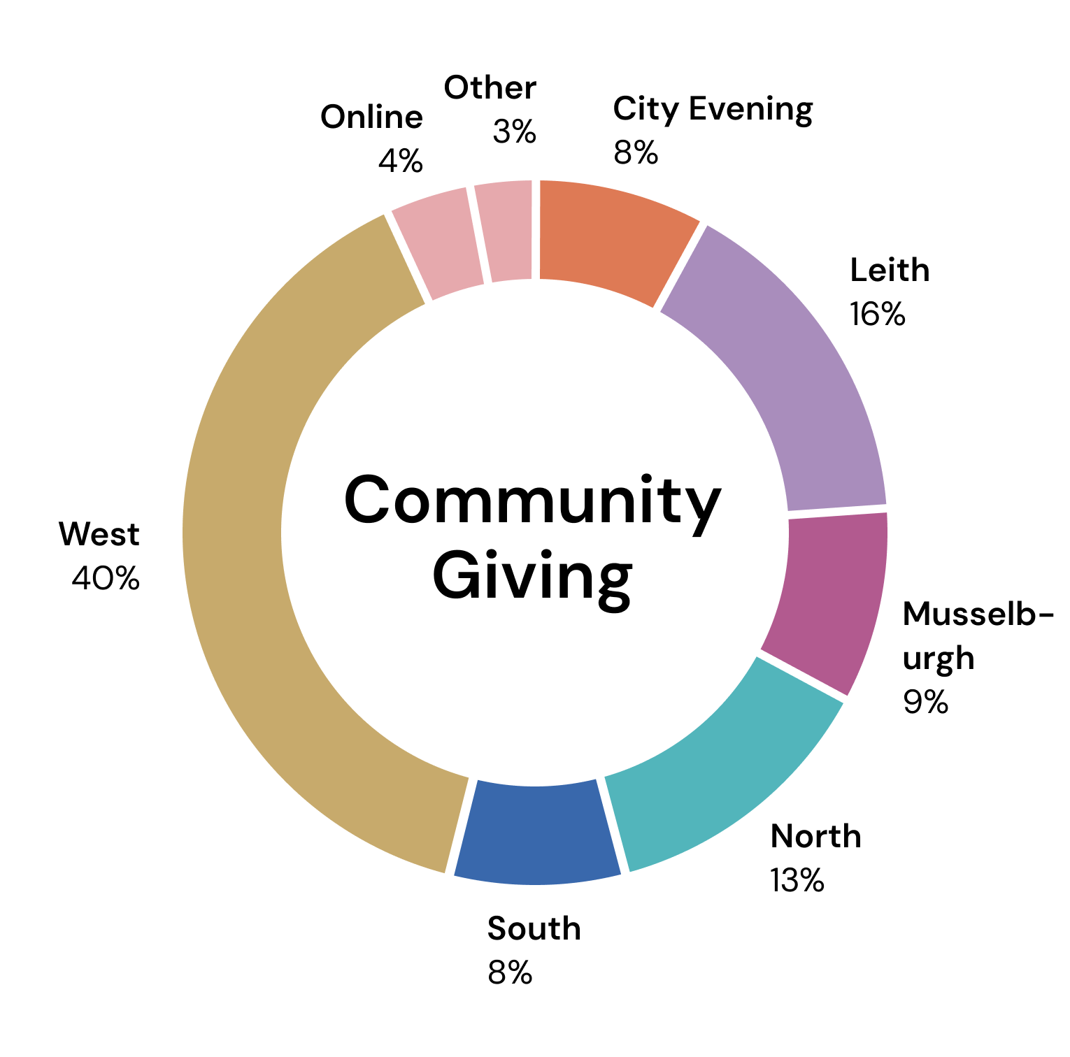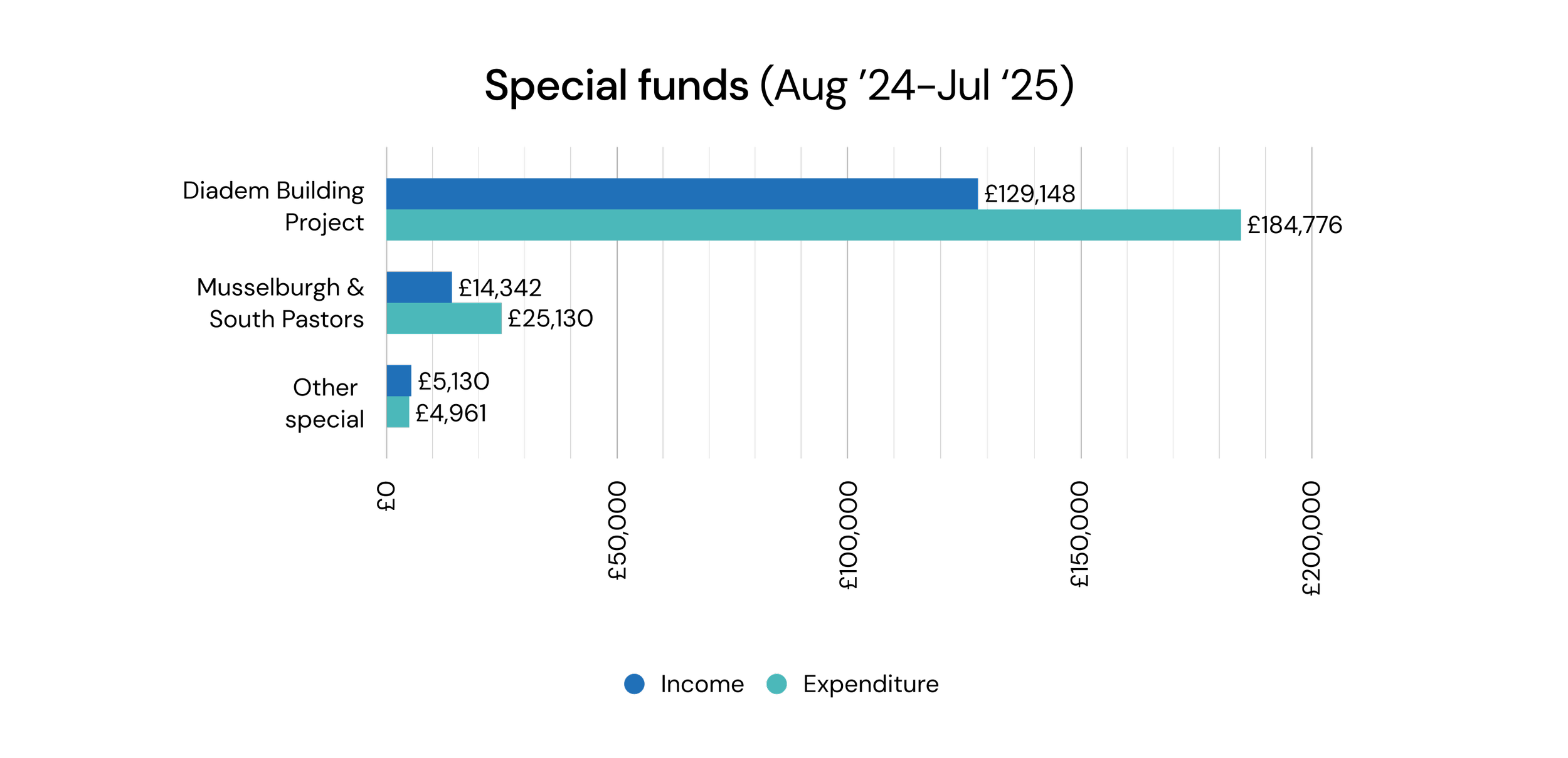 Special Giving: £24,506 was given to the Diadem Building Project, £2,738 and £722 to the Musselburgh and South Community Pastor Funds, and £3,732 to other causes.